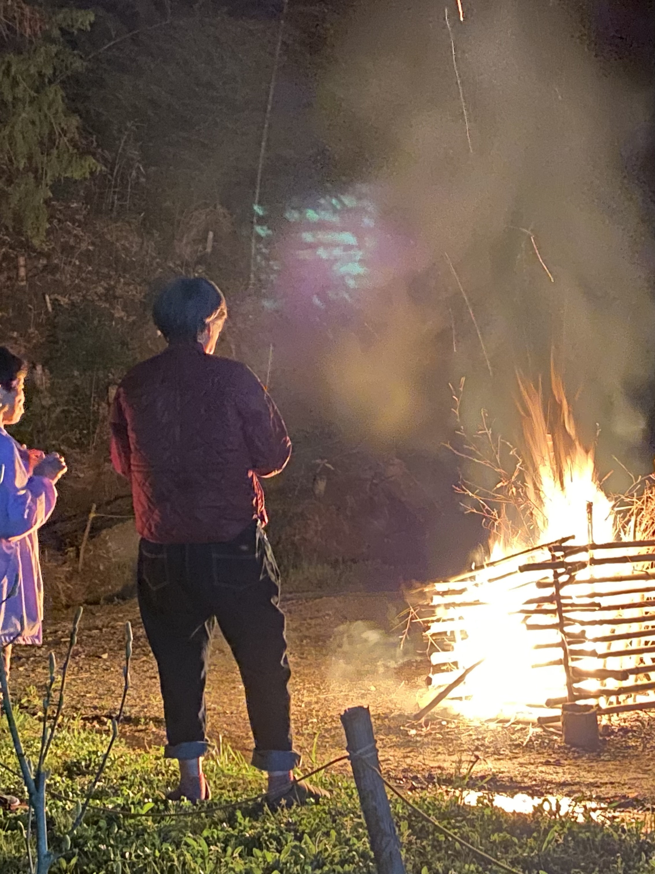 昼間吹いてた風も 夕方にはやんできたので、いつものように竹をくんで、キャンプファイヤーを行いました