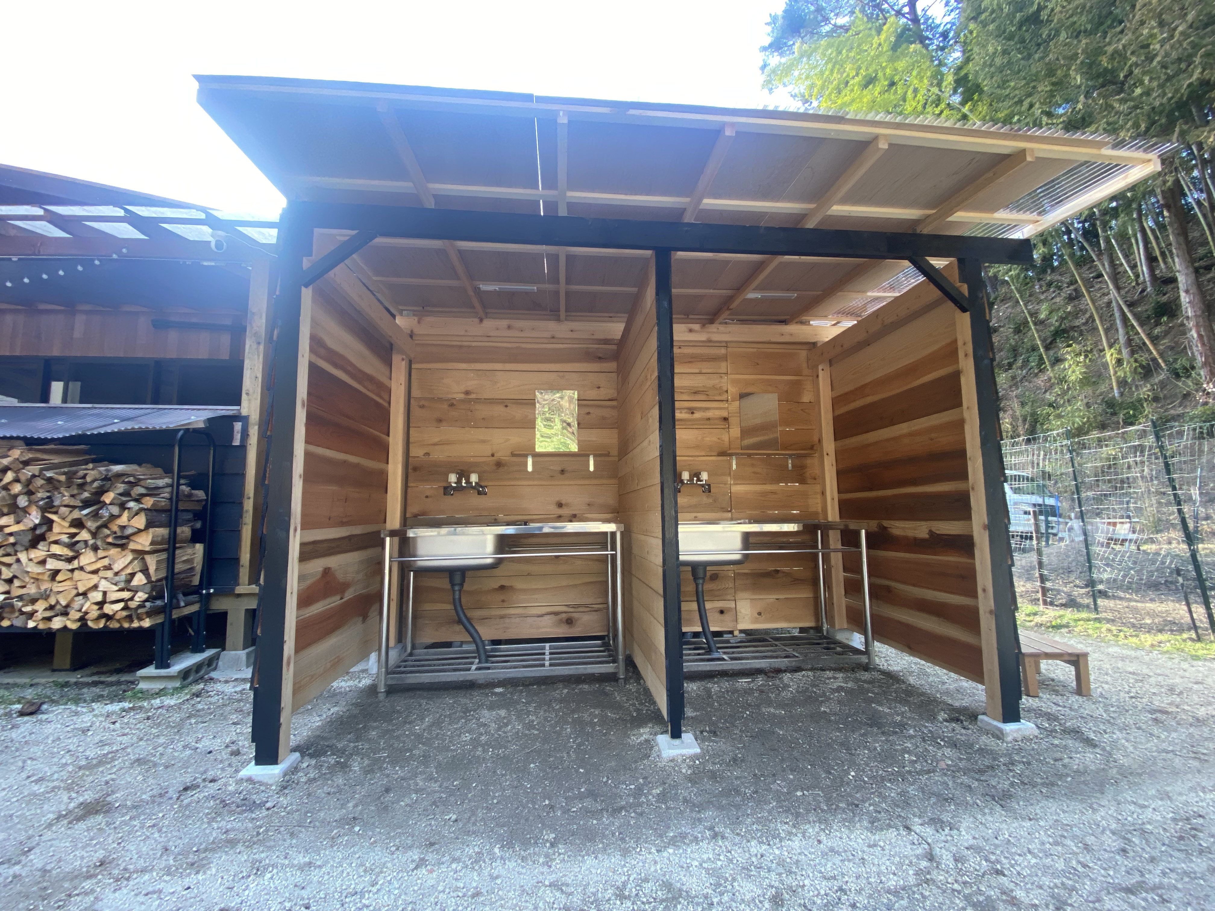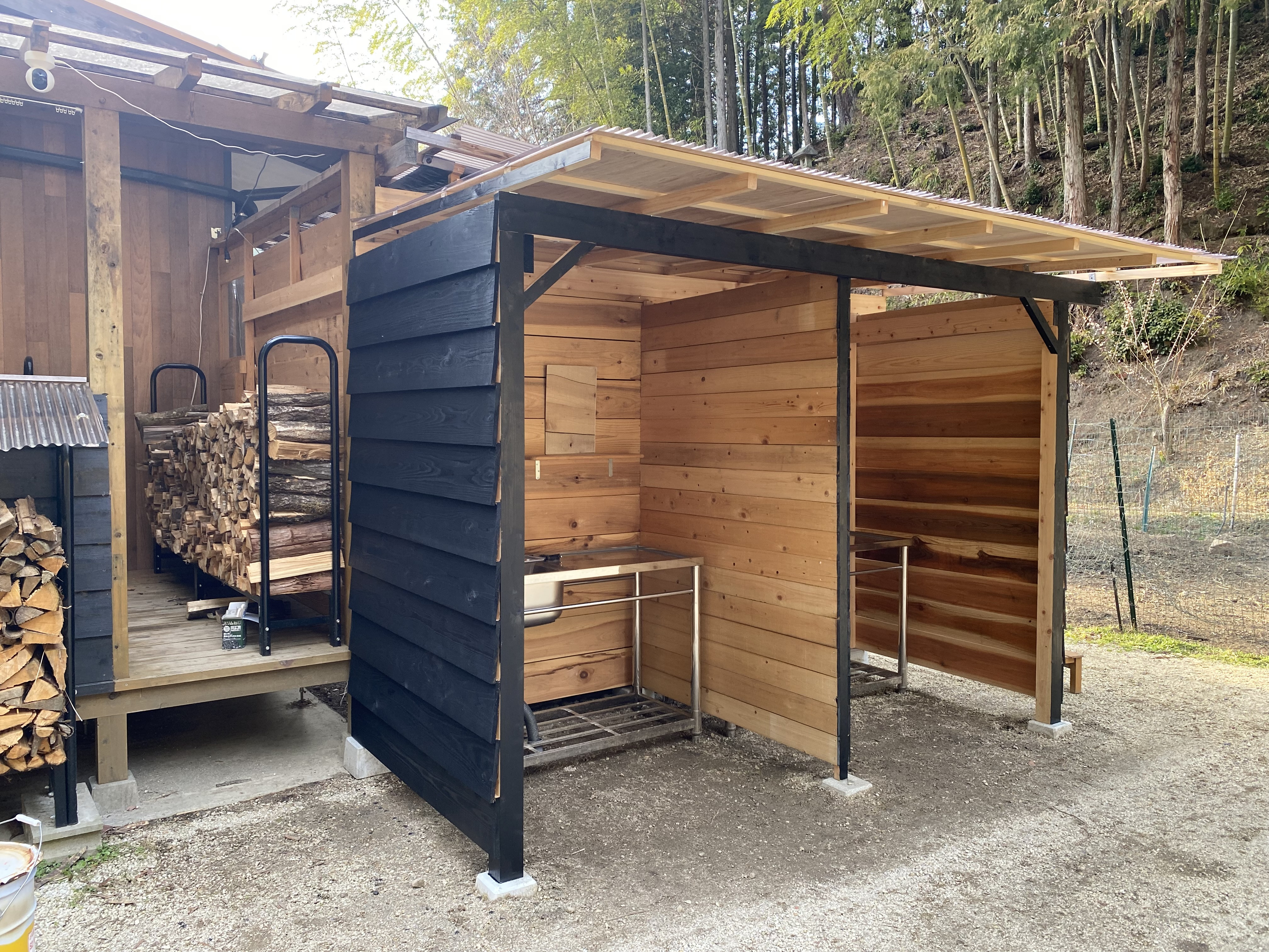 水場の屋根と壁をつけた後、真ん中に仕切りを作り、外の壁は黒いペンキで仕上げました。