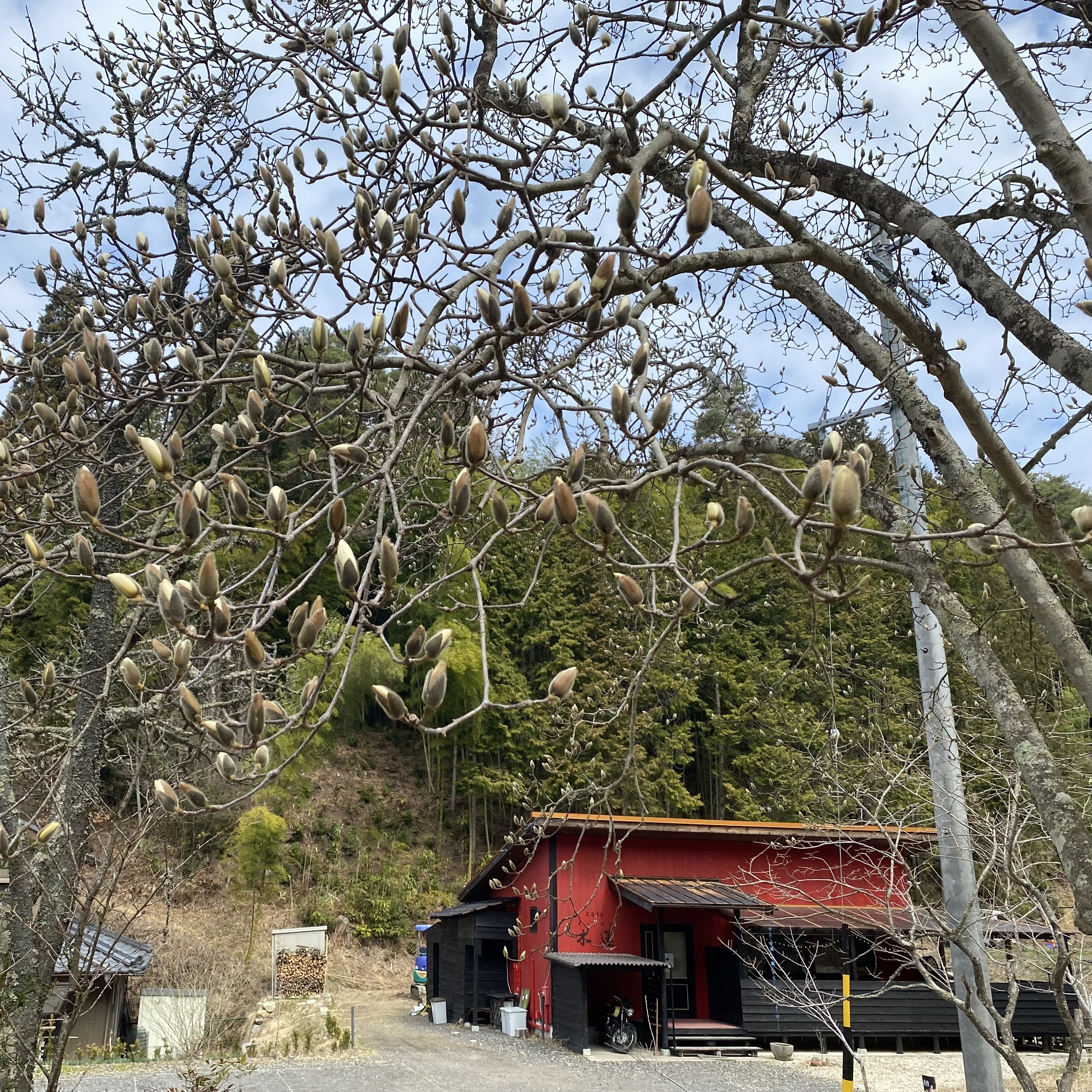 お店の入り口に木蓮の大樹がそびえたっています